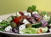 uborka, paradicsom, lilahagyma, olivabogyó, feta sajt, olivaolaj, fehérborecet, 2 db pizzastangli